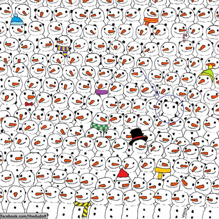В 2015 году художник Гергели Дудаш, больше известный в интернете как просто Dudolf, запустил популярную серию рисованных головоломок. Все началось с просьбы отыскать панду среди снеговиков.