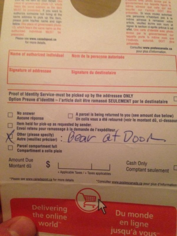 А вот в уведомлении почтальон в качестве причины недоставления посылки домой указывает "Медведь у двери".