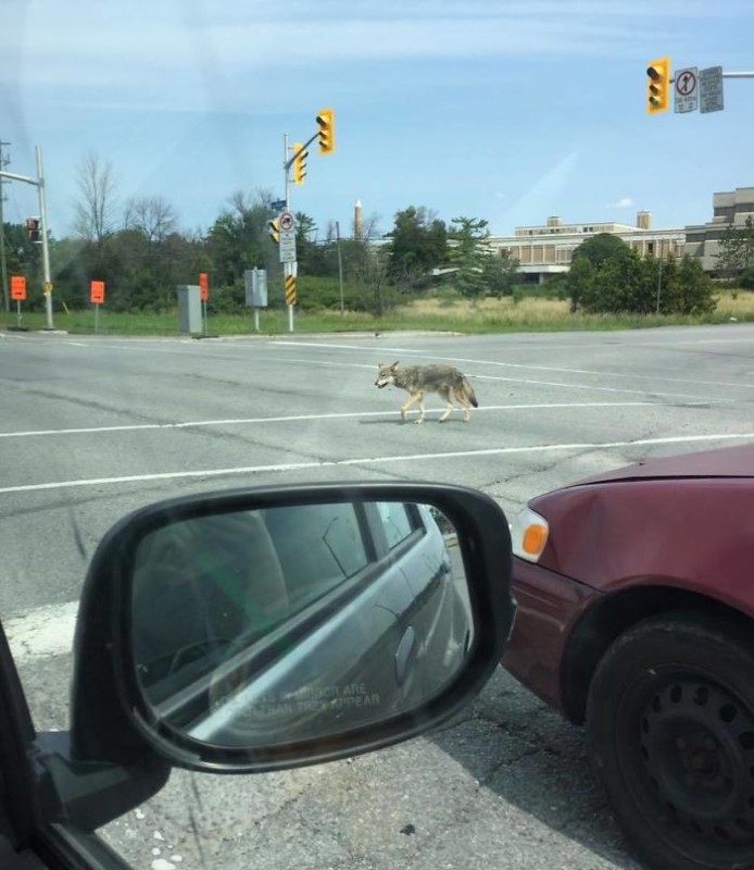 В Канаде даже животные соблюдают правила ПДД, только посмотрите на этого законопослушного койота.