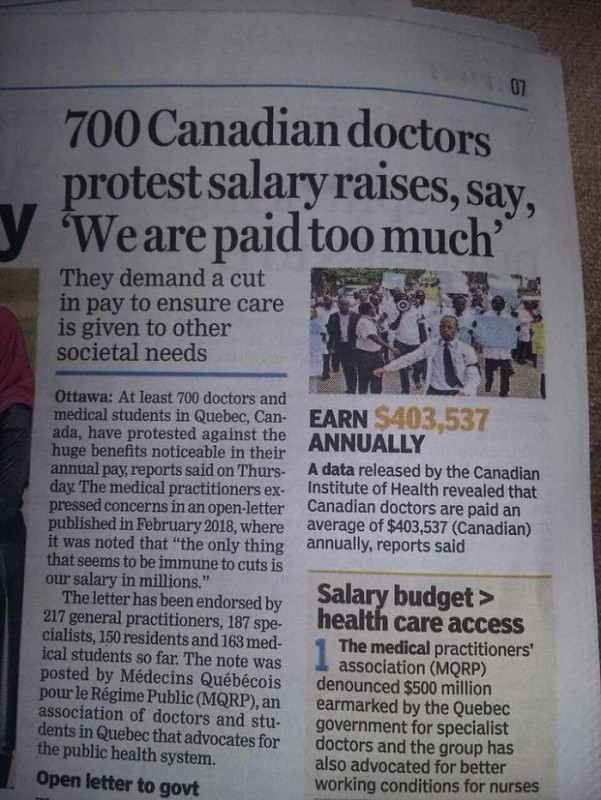 А вот еще пример щепетильности. Канадские врачи как-то попросили понизить себе зарплаты, чтобы хватило бюджетных денег на другие социальные расходы.