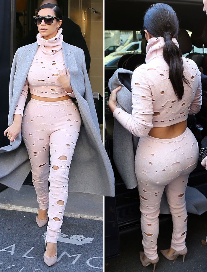Во время Недели моды в Париже дива ежедневно меняла наряды от ведущих люксовых марок - Balmain, Givenchy, Lanvin, Maison Martin Margiela, заставляя модных критиков начинать свои заметки словами: "Ладно, Ким, ты победила, у меня нет слов". Особенный ажиотаж вызвали ее выходы в юбке из перьев марабу и жакете Lanvin на голое тело, а также в полупрозрачном комбинезоне Givenchy.