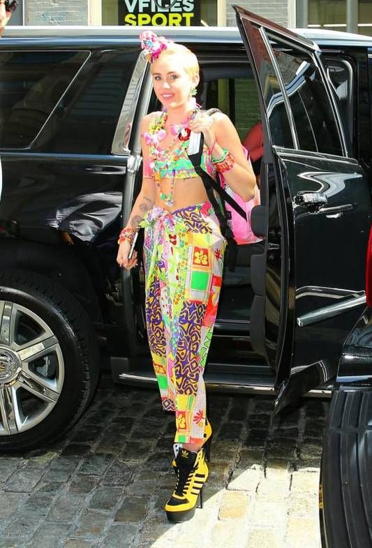 Скандальная американская певица Майли Сайрус выбрала для модного показа психоделический наряд и туфли Adidas на шпильках. После выхода топлес это просто праздник какой-то.