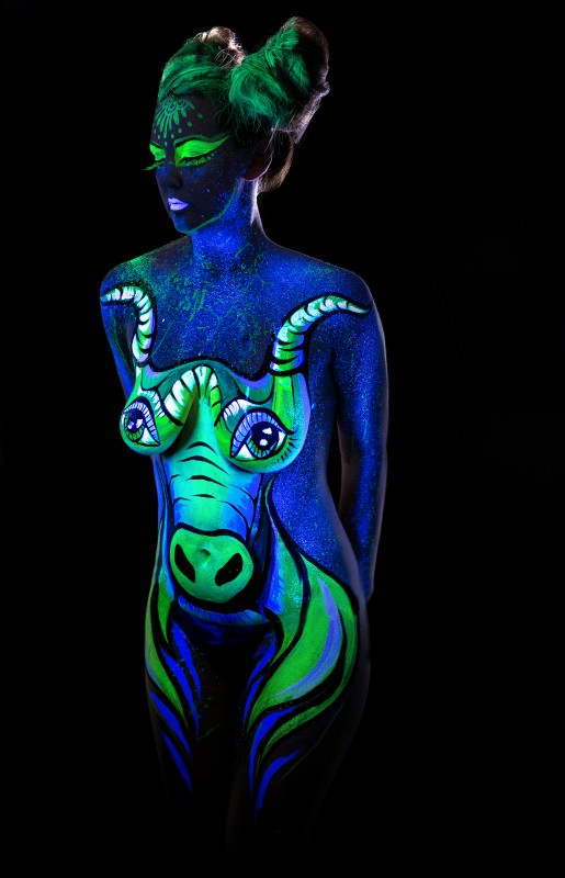 "Хотелось "поиграть" с рельефами тела, с позами, чтобы рисунок "сливался" с моделью. Задача непростая, поэтому где-то получилось, а где-то просто изобразили знак зодиака на спине. Несомненно работа была коллективной", - поделилась с нами Алена.