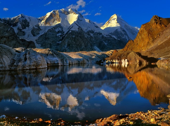 Сказка Тянь-Шаня. Пик Чапаева 6371 м и пик Хан-Тенгри, 7010 м. Моренные озера ледника Южный Иныльчек. Центральный Тянь-Шань.