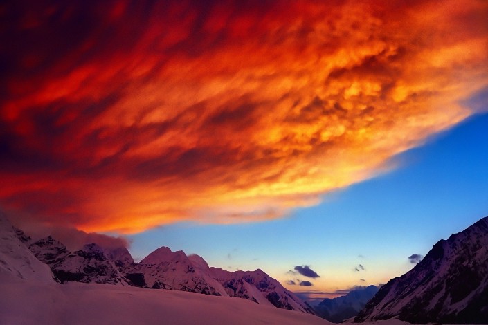 Армагеддон. Маковое небо Тянь-Шаня. Ледник Северный Иныльчек. Казахстан. Август, 2000 год. "В тот момент состояние неба вселяло ужас… Оно застало меня врасплох, без камеры. Камера была в базовом лагере. Идти до лагеря минут 15, добежал за 5. Пиковое состояние осталось только в памяти".