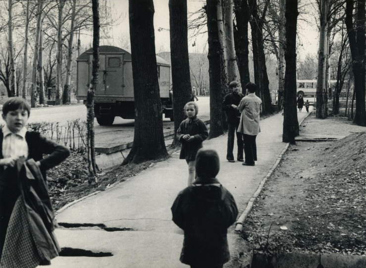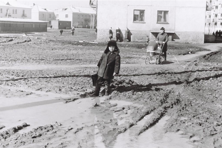 По его словам, в 1970-е годы здания на площади только строились, поэтому на фото нет людей. В левой стороне кадра виден башенный кран, а вдоль домов высажены саженцы, которые сейчас выросли в деревья.