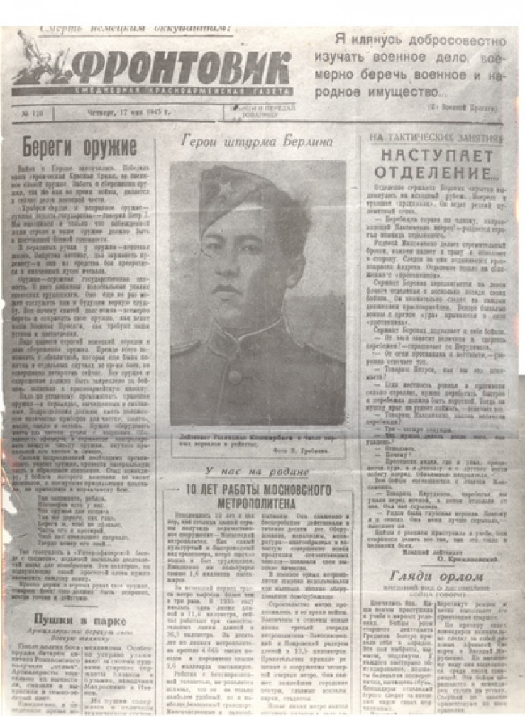 На фото слева направо: младший сержант М. Кантария, сержант М. Егоров, лейтенант Рахимжан Кошкарбаев, капитан С. Неустроев