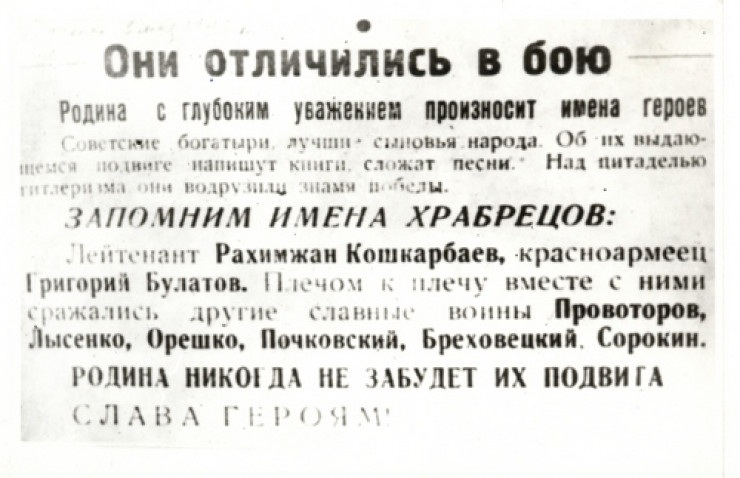 Вот как описывал водружение первого красного знамени сам Кошкарбаев: "Комбат Давыдов подвел меня к окну. "Видишь, - говорит, - Рейхстаг? Подбери нужных людей, будешь водружать флаг". И передал мне темный, довольно тяжелый сверток - флаг, завернутый в черную бумагу. С группой разведчиков я выскочил из окна. Вскоре нам пришлось всем залечь. Начался сильный огонь. Возле меня остался один боец. Это был Григорий Булатов. Он все спрашивал: "Что мы будем делать, товарищ лейтенант?" Мы лежали с ним возле рва, заполненного водой. "Давай поставим свои фамилии на флаге", - предложил я ему. И мы химическим карандашом, который у меня оказался в кармане, тут же, под мостиком лежа, написали: "674 полк, 1 б-н". И вывели свои имена: "Л-т Кошкарбаев, кр-ц Булатов". Мы тут пролежали до темноты. Потом началась артподготовка, и с первыми же выстрелами ее мы подбежали к Рейхстагу. Я поднял Булатова, придерживая его за ноги, и тут, на высоте второго этажа, установили флаг…".