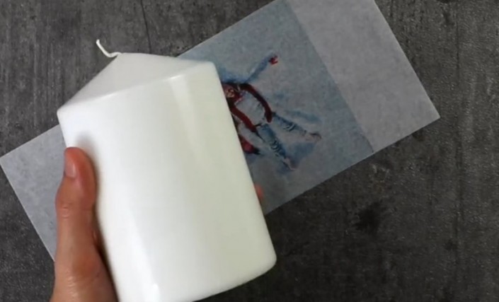 Теперь берем фото на кальке и накладываем на свечу как можно ровнее. Сверху накладываем восковую бумагу. Постараетесь, чтобы бумага прилегала плотно и под ней не было пузырьков воздуха.