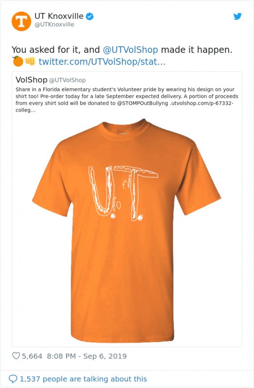 Более того, представители Университета Тенесси решили официально использовать созданный мальчиком логотип. Буквально за короткое время его рисунок уже красовался на рюкзаках, сумках и футболках. И студенты их начали скупать настолько активно, что сайт университета упал.