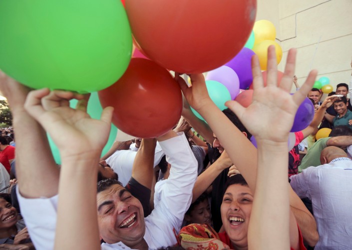 Египтяне пытаются поймать воздушные шары, выпущенные после молитв Ид аль-Фитр, в общественном парке недалеко от мечети. Каир, Египет.