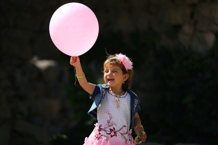 Девочка играет с воздушным шариком во время празднования. Даиль, Сирия.
