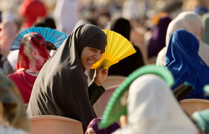 Счастливая женщина, спасающаяся от жары веером, после окончания утренней молитвы по случаю праздника. Полуанклав Испании Сеута.