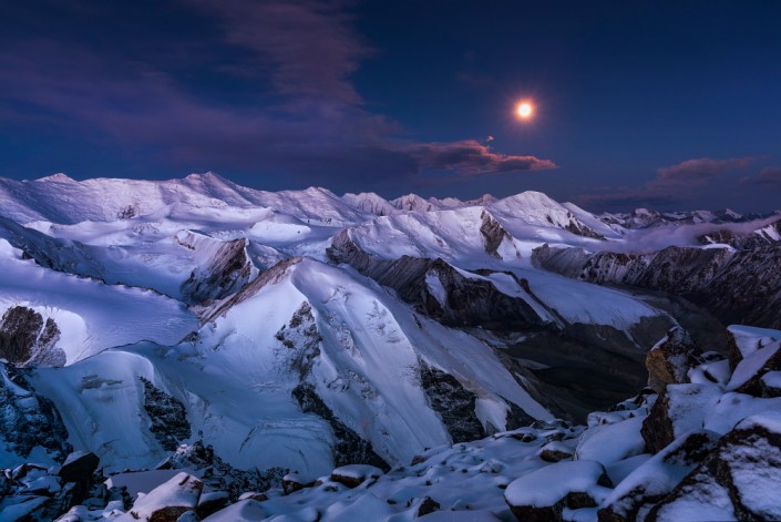 Закат луны на вершине пика Астана (4555 м), ущелье Баянкол, Центральный Тянь-Шань. Август 2017 год. © Ольга Кулакова.