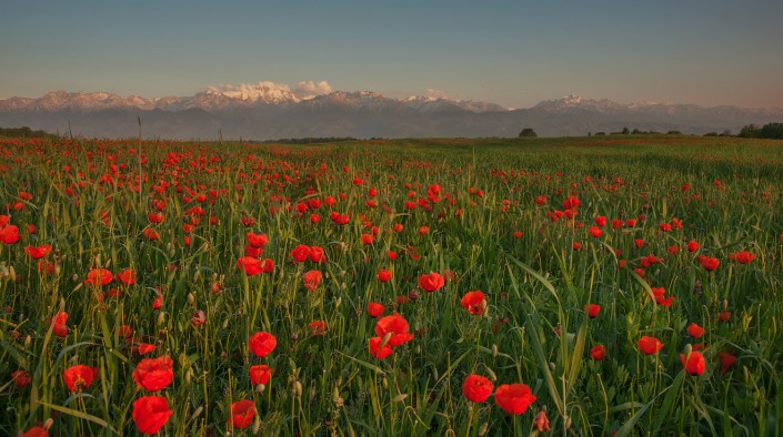 Маковые поля Алматинской области, на заднем плане пик Талгар (4973 м) – высшая точка Заилийского Алатау. Май, 2018 год. © Ольга Кулакова.
