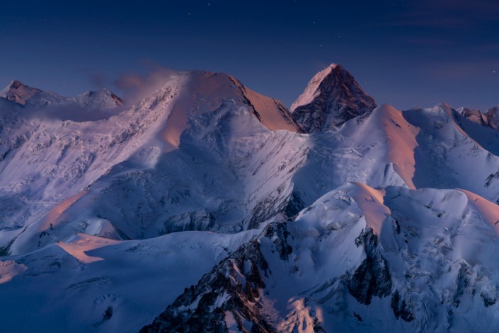 Слева направо: Пик Баянкол (5791 м), пик Хан-Тенгри (7010 м), пик Одиннадцати (5437 м). Центральный Тянь-Шань. Ущелье Баянкол. Снято с вершины пика Мукагали (4433 м) в предрассветных сумерках. Август, 2018 год. © Ольга Кулакова.