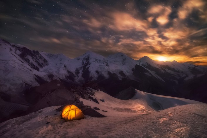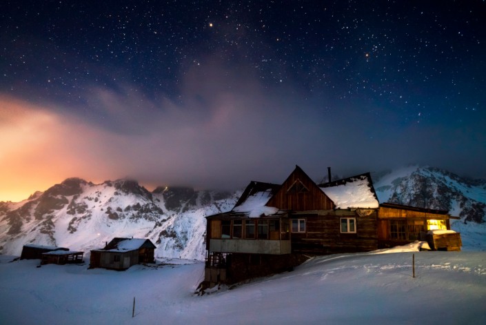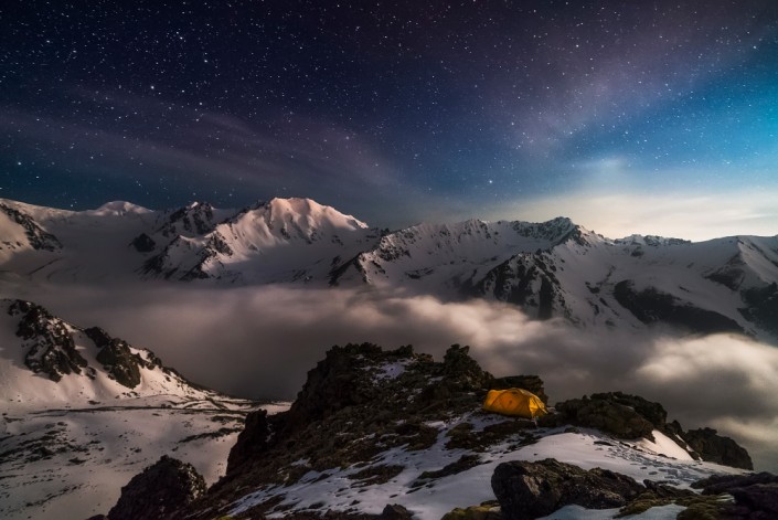 Ночь на гляциологической станции Т-1. Цирк ледника Туюк-Су, Малое Алматинское ущелье, Заилийский Алатау. Январь, 2019 год. © Ольга Кулакова.