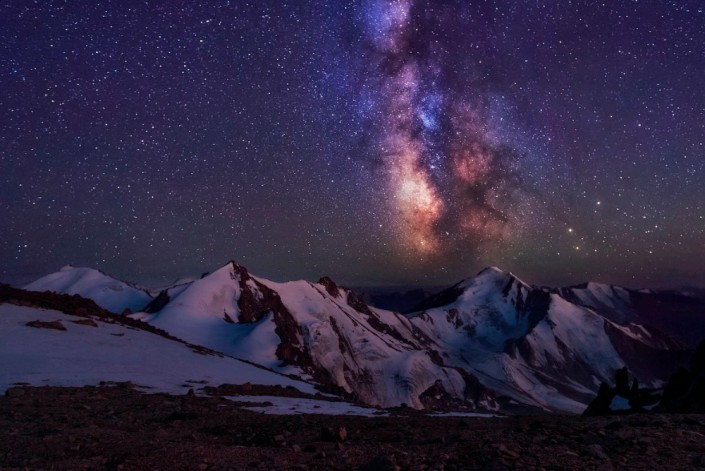 Ночь на вершине пика Молодежный (4147 м), Малое Алматинское ущелье, Заилийский Алатау. Слева направо: пик Погребецкого (4231 м), пик Локомотив (4182 м), пик Горельник (4000 м), пик Советов (4317 м). Август, 2016 год. © Ольга Кулакова.