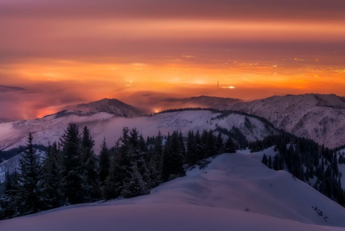 Вид на ночной Алматы. Ущелье Кимасар, Заилийский Алатау. Декабрь, 2016 год. © Ольга Кулакова.