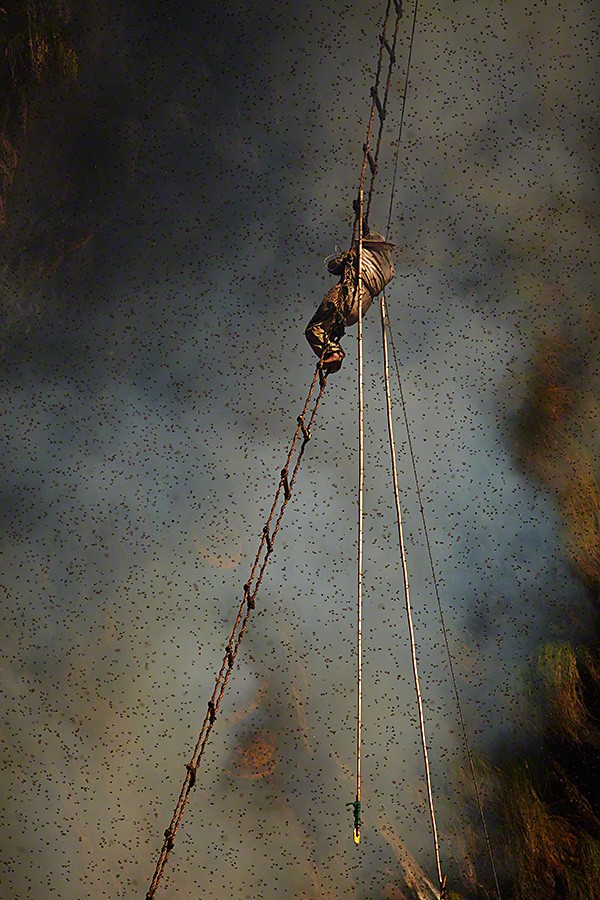 Взобравшись по шатким лестницам наверх, охотники за медом прогоняют пчел из ульев при помощи дыма и забирают свою сладкую добычу.