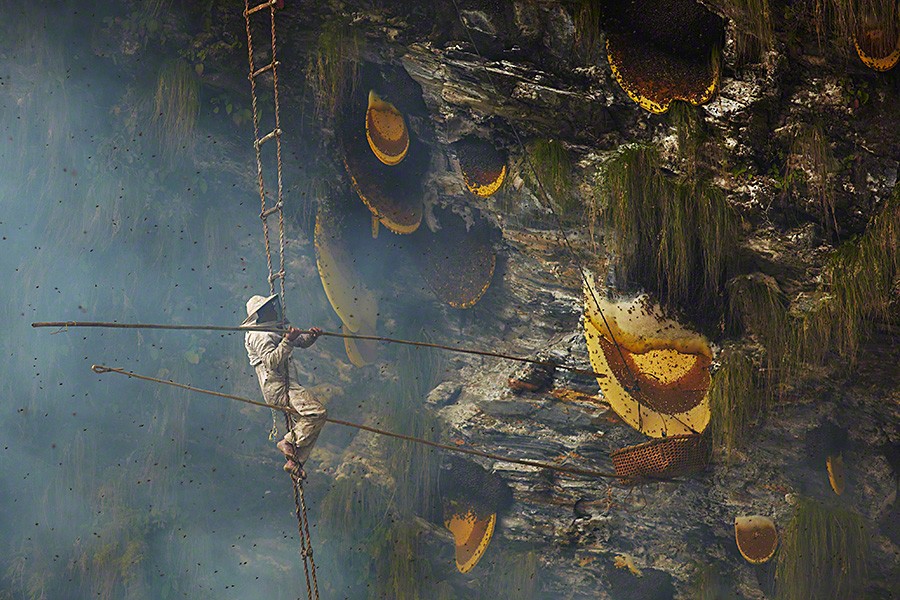 Высоко в предгорьях Гималайских гор, в центральном Непале охотники за медом из племени гурунг дважды в год, рискуя жизнью, взбираются на крутые утесы скал, чтобы забрать мед у самых крупных и опасных пчел в мире. В этой местности люди стали собирать мед примерно 12 тысяч лет назад, а навыки, необходимые для поддержания этой древней и священной традиции, на протяжении сотен лет передаются из поколения в поколение. Путешественник и фотограф Эндрю Ньюи (Andrew Newey) провел две недели с этим племенем и задокументировал их древнюю традицию в своем проекте "Гурунги - охотники за медом".
