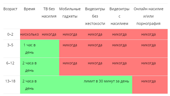 Завершая свою статью, Крис Роуэн рекомендует временные рамки, которые являются приемлемыми для детей разных возрастов.