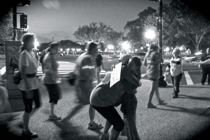 "Эту одиннадцатилетнюю девочку зовут Бекка Тейлор. Семь часов подряд она стоит на одном месте с плакатом "Объятия здесь". Мимо нее пробегают люди - участники волонтерского забега, чьи близкие покончили жизнь самоубийством. Это фото с третьего марафона, в котором участвовала Бекка. К этому моменту она обняла больше тысячи человек.