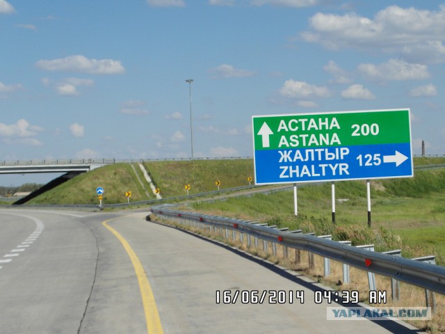Впереди - столица Казахстана Астана. Едем по автобану, указатели зеленого цвета, разрешенная скорость до 140 километров в час.