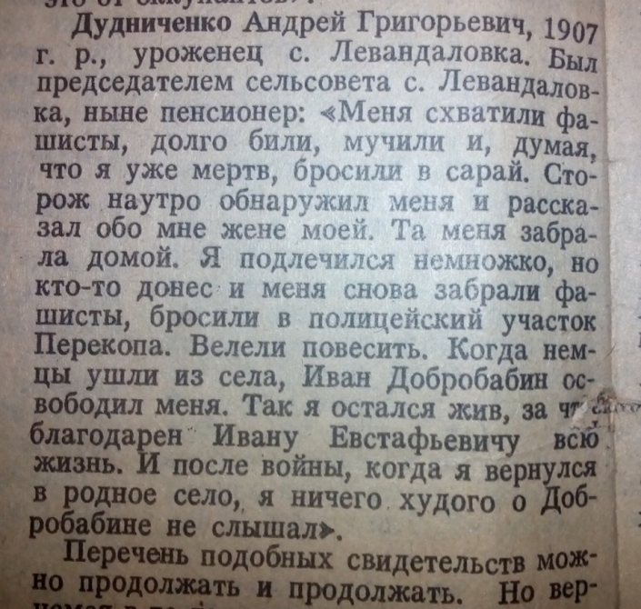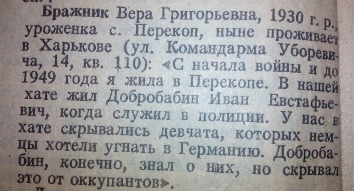 В 1989 году в Казахстане был снят документальный фильм "Подвиг и подлог". Журналисты побывали в селе Перекоп. В то время здесь еще было немало людей, которые пережили немецкую оккупацию. Они рассказали, как Добробабин спасал людей. Предупреждал их об арестах, облавах, готовил им поддельные документы. Он был своим среди чужих.