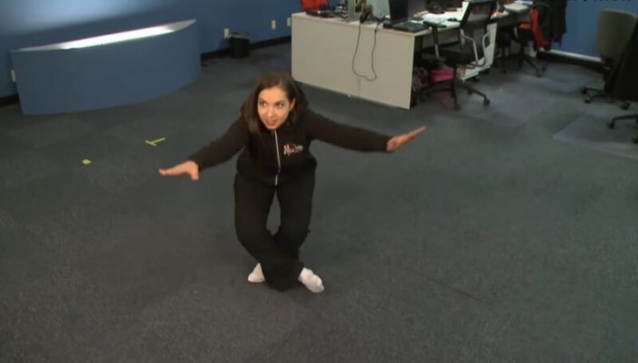 Из этой позиции начните медленно садиться. Нельзя помогать себе руками, коленями или как-то еще, также нельзя просто плюхаться на пятую точку, это считается за ошибку. Если вы все же используете опору, то теряете один балл. Если вам удалось сесть таким образом, но вам сложно удержать баланс, отнимается полбалла.
