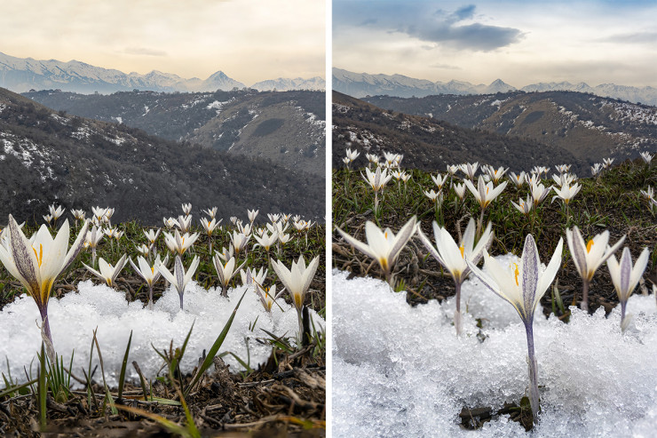 "Подснежников в этом году было много в начале марта, тогда мне удалось сделать хорошие фото. Но после пришедших дождей и холодов их стало меньше, они закрылись и прилегли на землю. А видео-таймлапс я снял 21 марта, поймал момент с более-менее подходящей погодой", - добавил он.