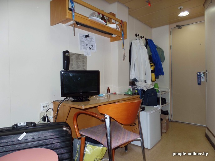Что сказать… Порт там прямо в поле. Вокруг пустота, глазу не на чем задержаться. Думаю: куда я попал? А потом было первое знакомство с каютой, и снова шок: разве здесь можно провести хотя бы месяц?.. Нас водили по лайнерам, но в жилую часть мы не заглядывали, чтобы не мешать команде. И вот захожу в каюту - а она, мягко говоря, небольшая. Стоит двухуровневая кровать, есть душевая (тут нам сильно повезло), небольшой холодильник, стол и телевизор. Соорудил себе подобие полочек возле кровати. В итоге привык.