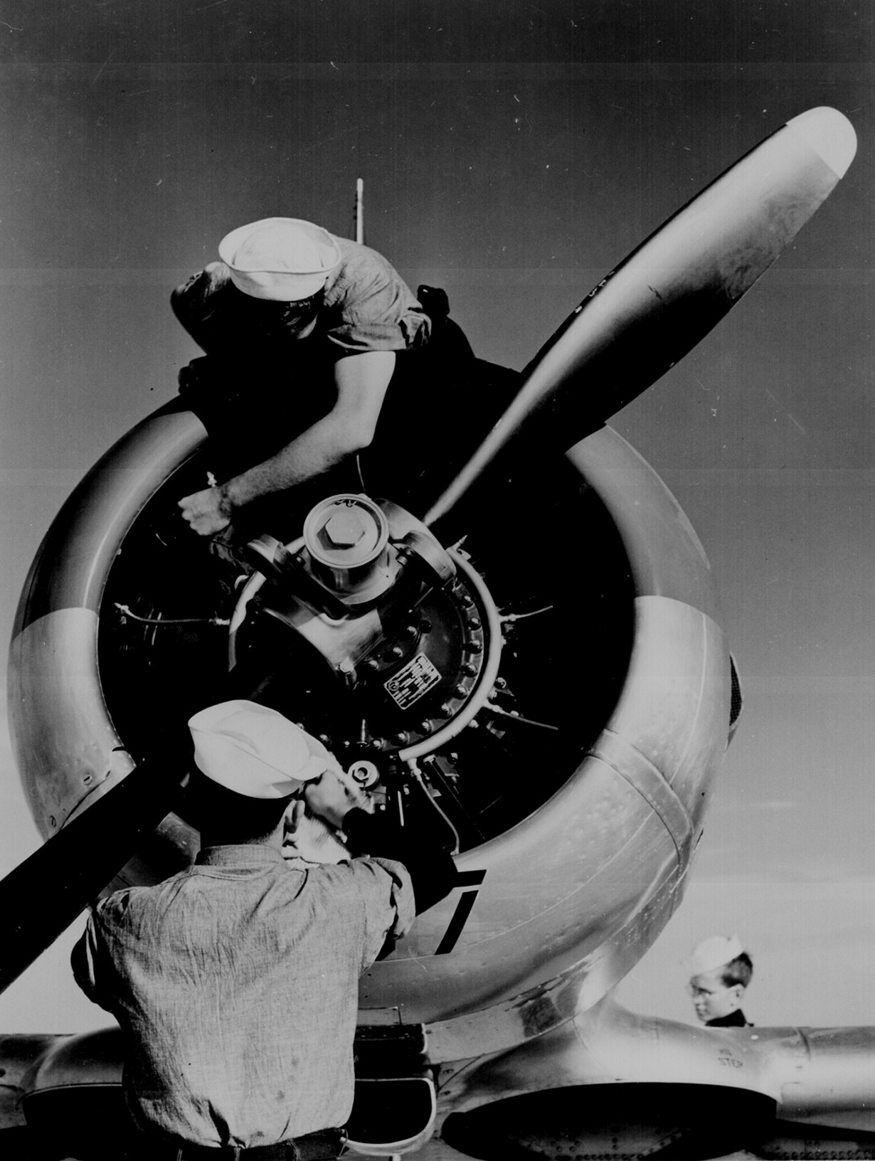 Механики проверяют двигатель самолета, Техас, ноябрь 1942 года.