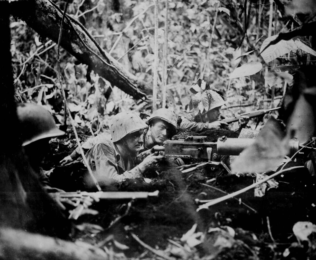 Морские пехотинцы США в джунглях мыса Тоткина, отвоеванного острова Бугенвиль, Соломоновы острова, январь 1944 года.