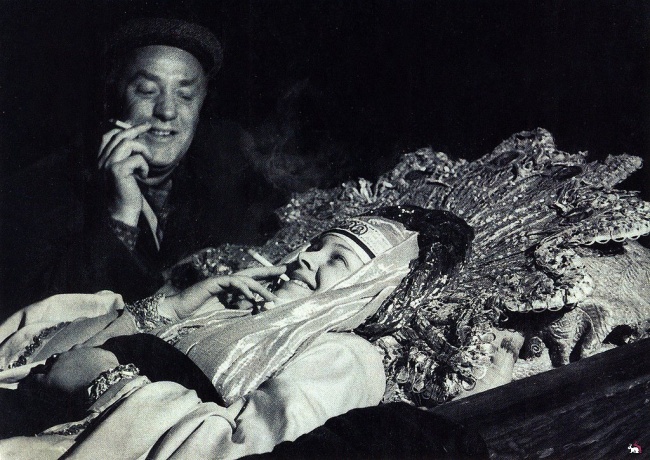 Кадр со съемок фильма Сергея Эйзенштейна "Иван Грозный". Малюта Скуратов (актер Михаил Жаров) у гроба царицы Анастасии (актриса Людмила Целиковская). Перекур.
