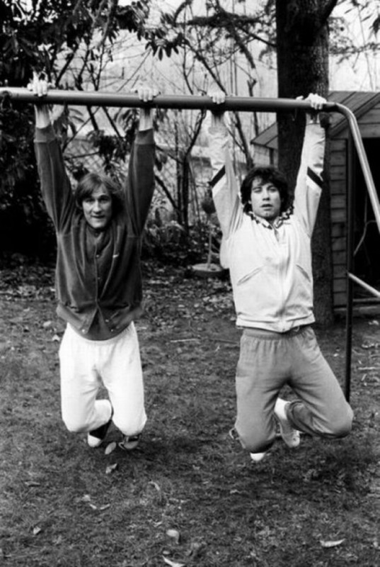 Жерар Депардье и Джон Траволта висят на низком турнике.