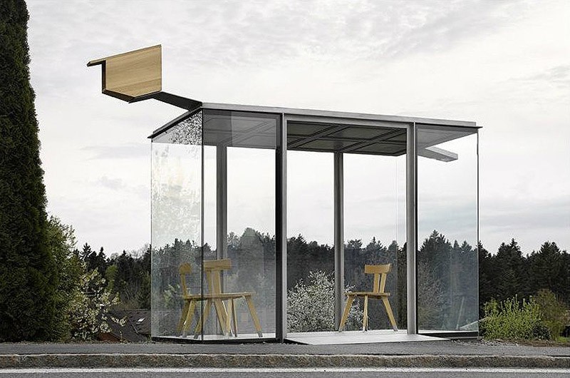 Эта остановка а-ля деревянная башня российского архитектора Александра Бродского открыта со всех сторон, чтобы ветер и птички могли пролетать через нее. Столик и скамейка обеспечивают достаточно комфортное ожидание автобуса.
