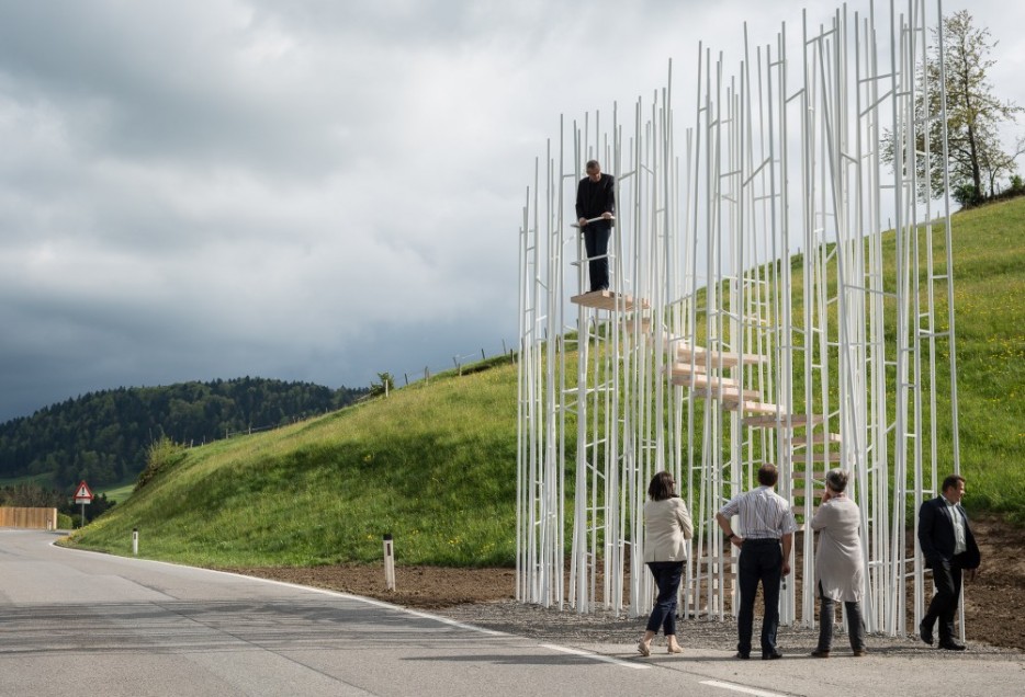В поселке Крумбах, Австрия, как-то раз бесплатно отдыхали семь известнейших на весь мир архитекторов. В чем подвох? Они создали самую инновационную остановку, которую только смогли придумать. Эта минималистическая скульптура - дело рук бельгийских архитекторов Яна де Вильдера, Инге Винка и Джо Тайлле. Она якобы имитирует форму Альп.