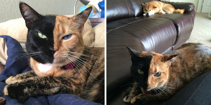 Двуликая кошка Венус. Ее мордочка разделена на две разноцветные половинки диаметрально противоположного окраса (@VENUSTWOFACECAT)