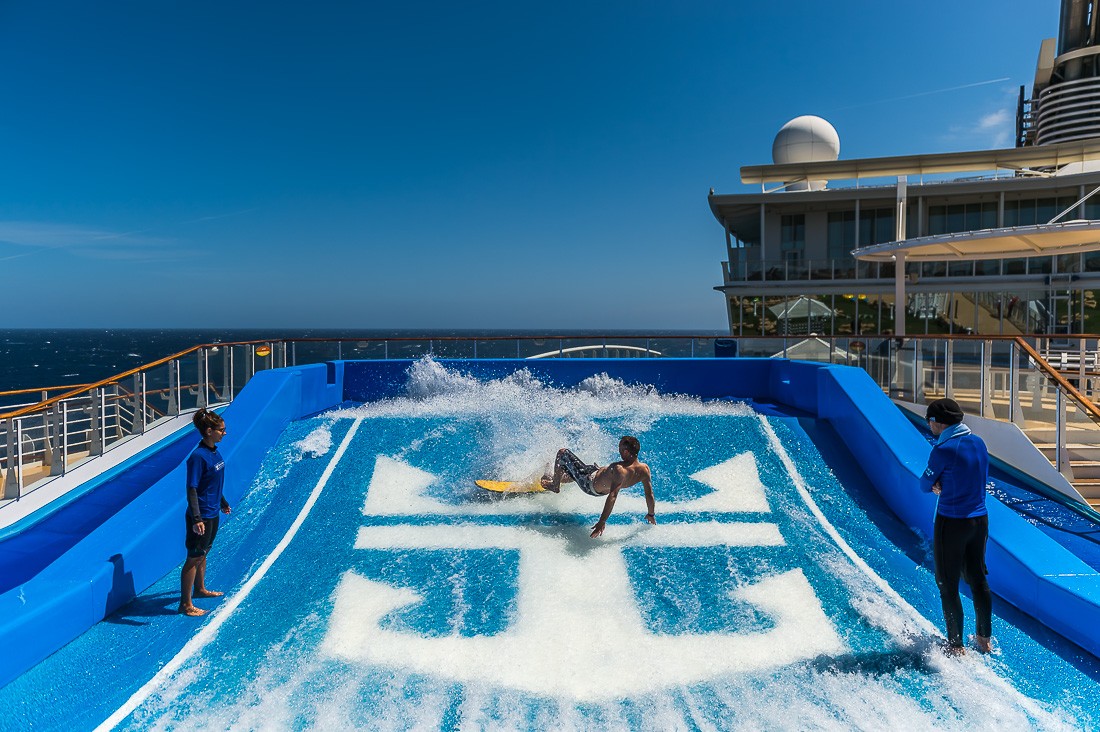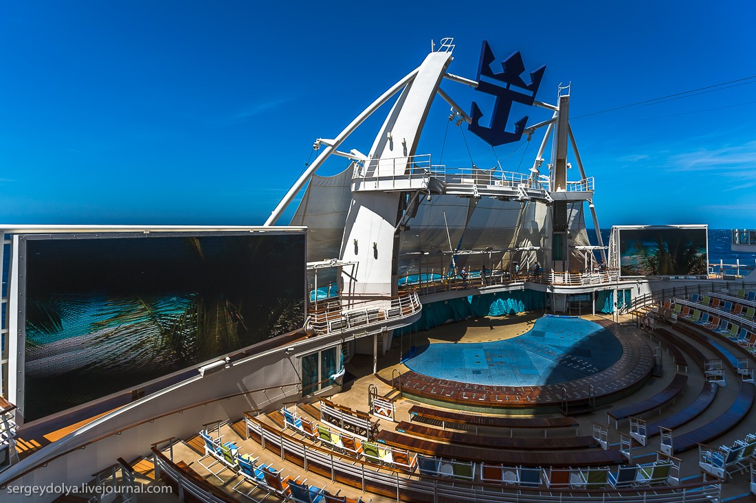 На верхней палубе имеются "крылья", которые выступают из корпуса лайнера в стороны. В крыльях по два больших джакузи. Лежишь в теплой воде на высоте 18-го этажа над морем и смотришь на волны под тобой. Очень круто.