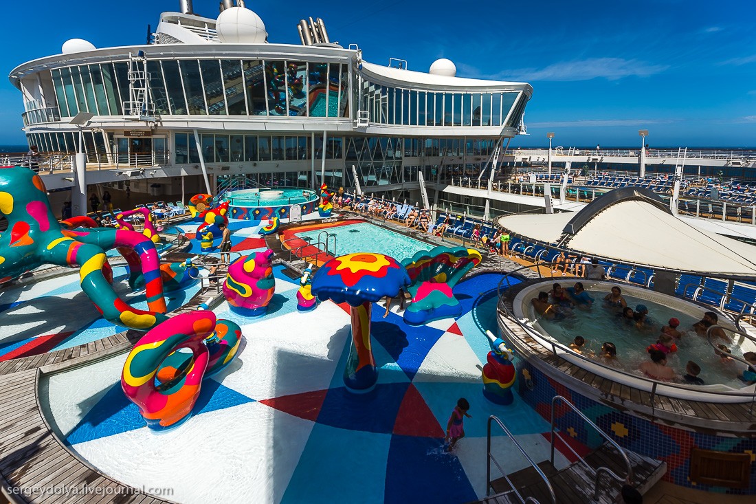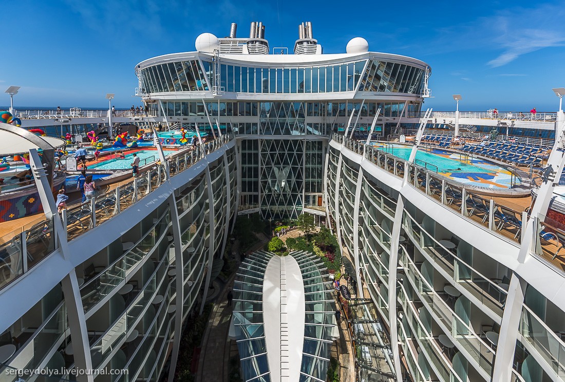 Рассказывает блогер Сергей Доля: "Представьте себе квартал Лас-Вегаса, который плывет из города в город. Представьте корабль на 7500 человек, из которых 2500 - сотрудники и персонал. Добавьте к ним ледовый каток, волейбольные и баскетбольные площадки, поле для гольфа, зал для боулинга, стены для скалолазания, фитнес-центр, SPA-салон, бесконечные бассейны и вы получите самый большой круизный лайнер в мире - Allure of the Seas".