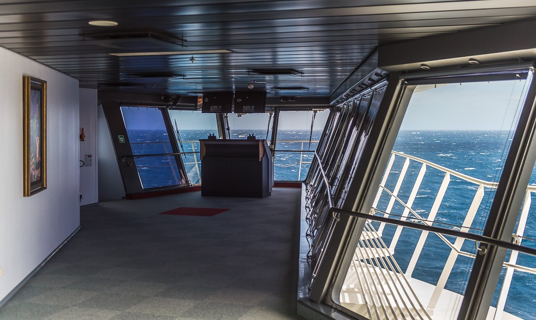 На капитанский мостик нет экскурсии, но мне повезло плыть вместе с группой испанских журналистов. Их визит был согласован, и мне удалось примазаться к этой компании. Капитанский мостик выглядит пустовато. Огромная площадь, но органы управления занимают лишь небольшой участок по центру. Кораблем управляет не капитан, а первый офицер. Он нам и проводил экскурсию. Офицера зовут Геннадий. Он из Одессы. Наш хлопчик.