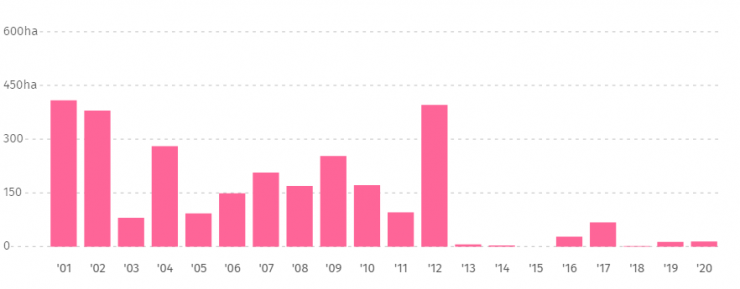 В Алматинской области за последние 19 лет также наблюдается сокращение лесных угодий. Наибольшая потеря лесного покрова размером в 727 гектаров произошла в Балхашском районе по сравнению со средним показателем в 165 гектаров. В 2021 году в регионе сгорело 12 тысяч гектаров земли.