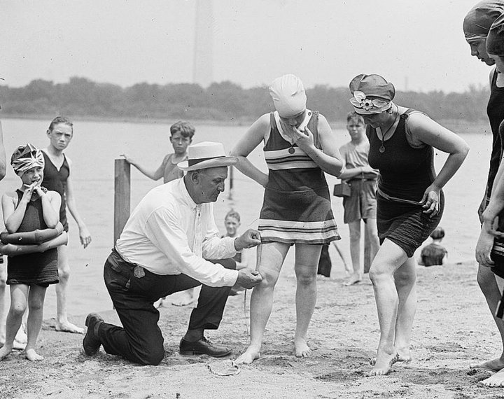 1920-е годы. Чиновник на американском пляже замеряет размер женского купальника. Если он оказывался ниже нормы, купальщицу штрафовали. Расстояние между подолом и коленом не должно было