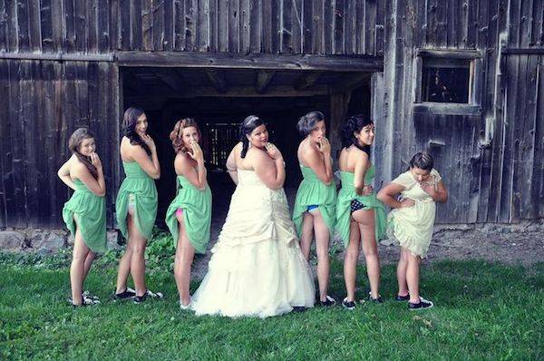 В США недавно зародился и быстро набирает популярность новый тренд - фотографироваться с оголенной пятой точкой, пишет Metro. При этом задом к камере в основном поворачиваются невеста и ее подружки. На некоторых снимках девушки лишь демонстрируют свое нижнее кружевное белье, на других же позируют с полностью обнаженной попой.