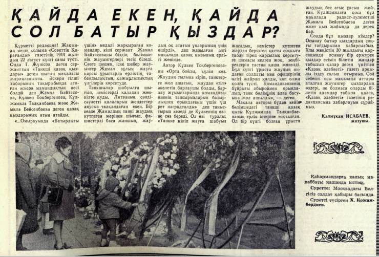 В канун 30-летия Великой Победы писатель-фронтовик Калмухан Исабаев написал в газету "Қазақ әдебиеті" статью о героических девушках, описывая их подвиги, которые стали известны благодаря Топатаю Жунусову. В статье он задается вопросами: "Кто они, эти девушки? Какова их судьба?" Через газету он обращается ко всем читателям и просит откликнуться тех, кому что-то известно об этих девушках.