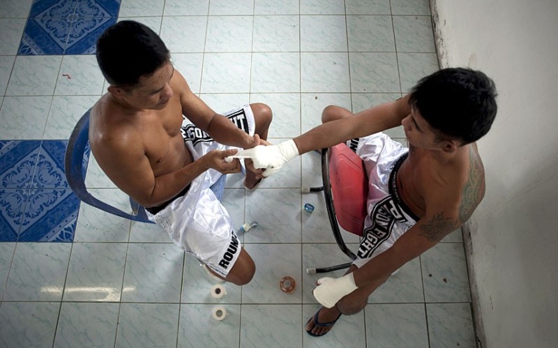 Заключенный помогает перевязывать руки другому заключенному перед боем.