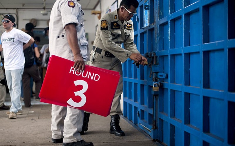 Тюремный охранник внимательно следит, за помощниками, которые делают массаж перед боем другому заключенному.