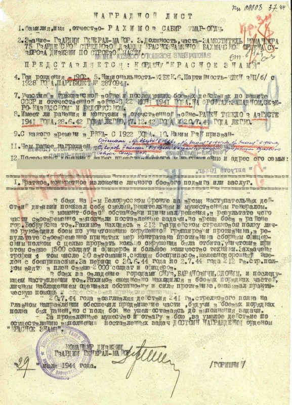 "За время наступательных действий дивизии показал себя смелым, решительным и мужественным генералом. Возглавляя действия 241-го гвардейского стрелкового полка, на главном направлении обеспечил продвижение части. Будучи в боевых порядках полка, был ранен, но с поля боя не ушел, оставаясь до выполнения задачи", - говорится в наградном листе на имя Рахимова.