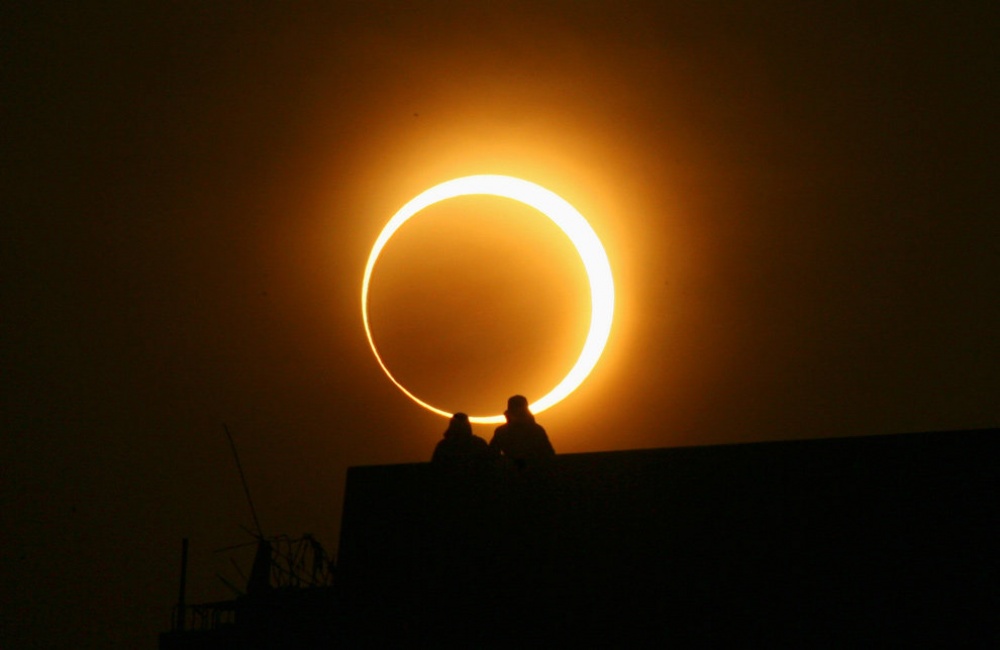 Жители китайского города Чжэнчжоу наблюдают кольцеобразное солнечное затмение 15 января 2010 года.